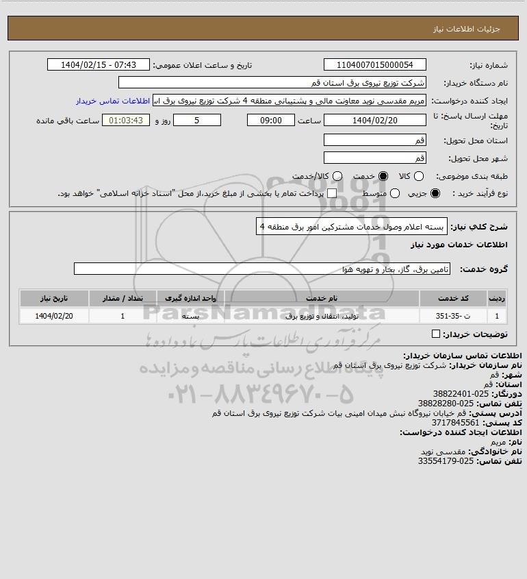 شرح کلی نیاز: بسته اعلام وصول خدمات مشترکین امور برق منطقه 4