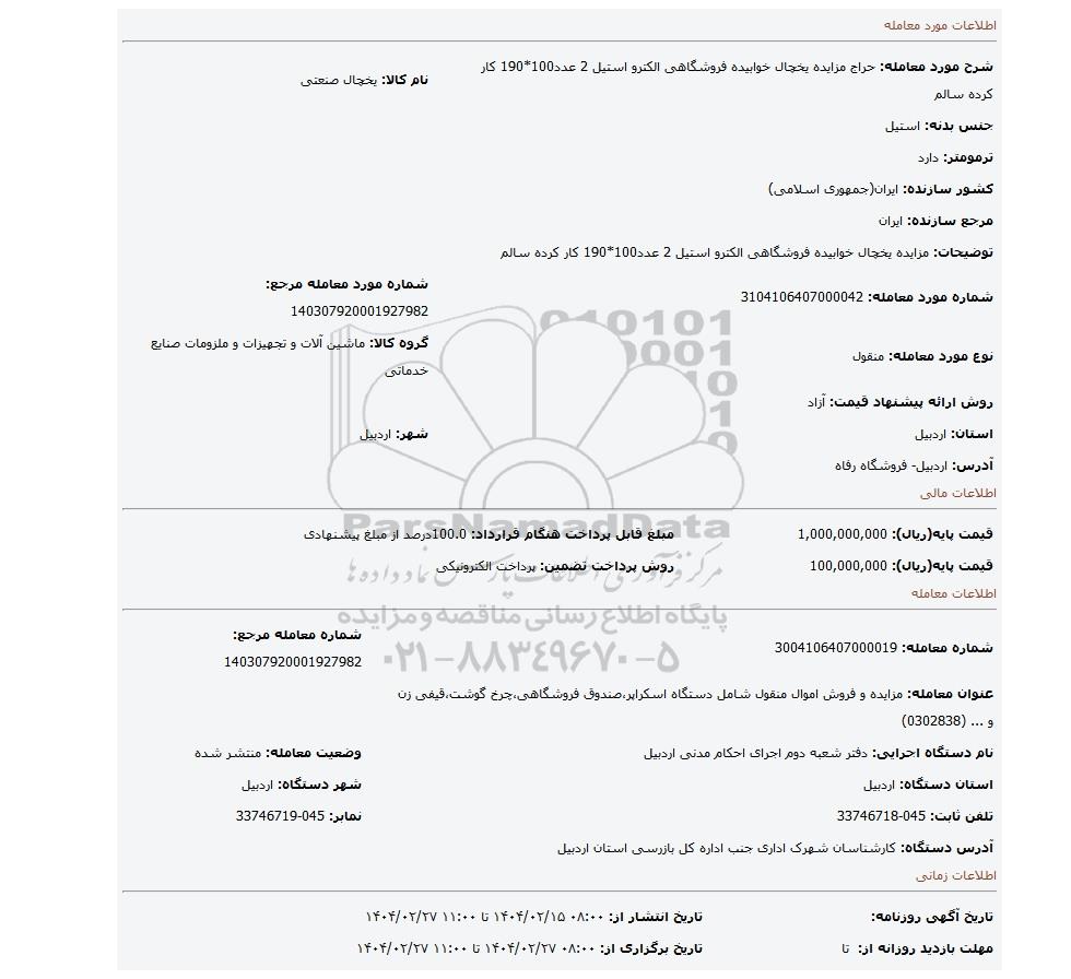 شماره مورد معامله: 3104106407000042 | شماره مورد معامله مرجع: 140307920001927982 | |