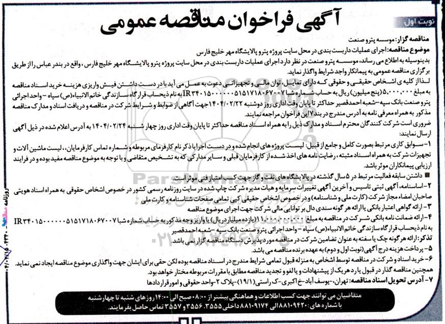بدینوسیله به اطلاع می رساند موسسه پترو صنعت در نظر دارد اجرای عملیات داربست بندی در محل سایت پروژه پترو پالایشگاه مهر خلیج فارس ، واقع در بندر عباس را از طریق برگزاری مناقصه عمومی به پیمانکار واجد شرایط واگذار نماید.