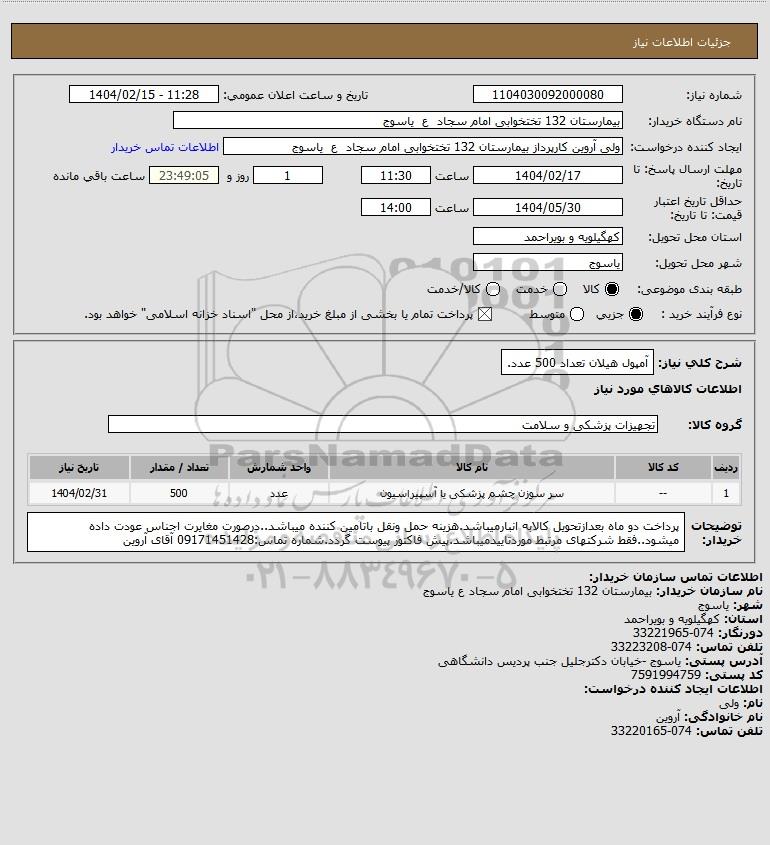 شرح کلی نیاز: آمپول هیلان تعداد 500 عدد.