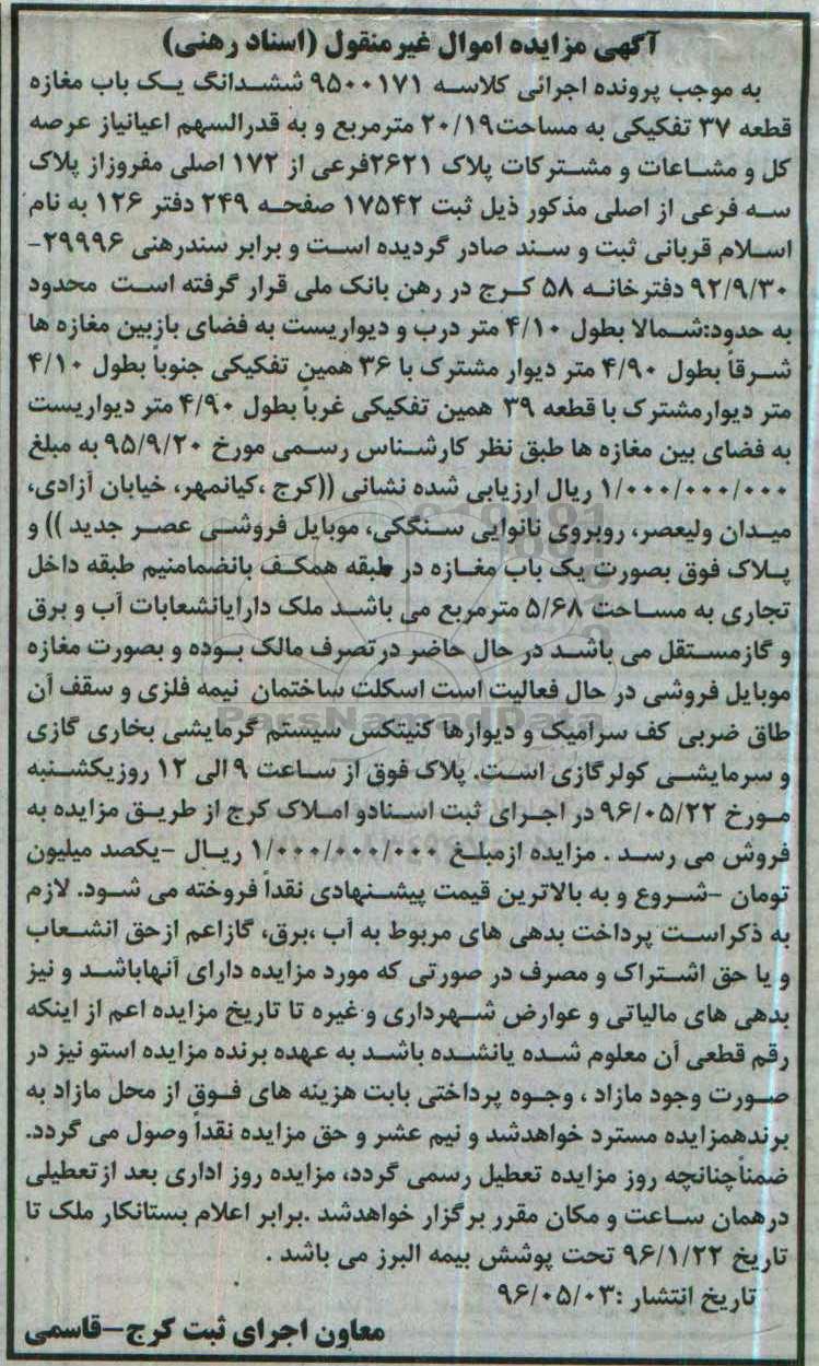 مزایده ششدانگ مغازه مساحت 20.19مترمربع کلاسه 9500171
