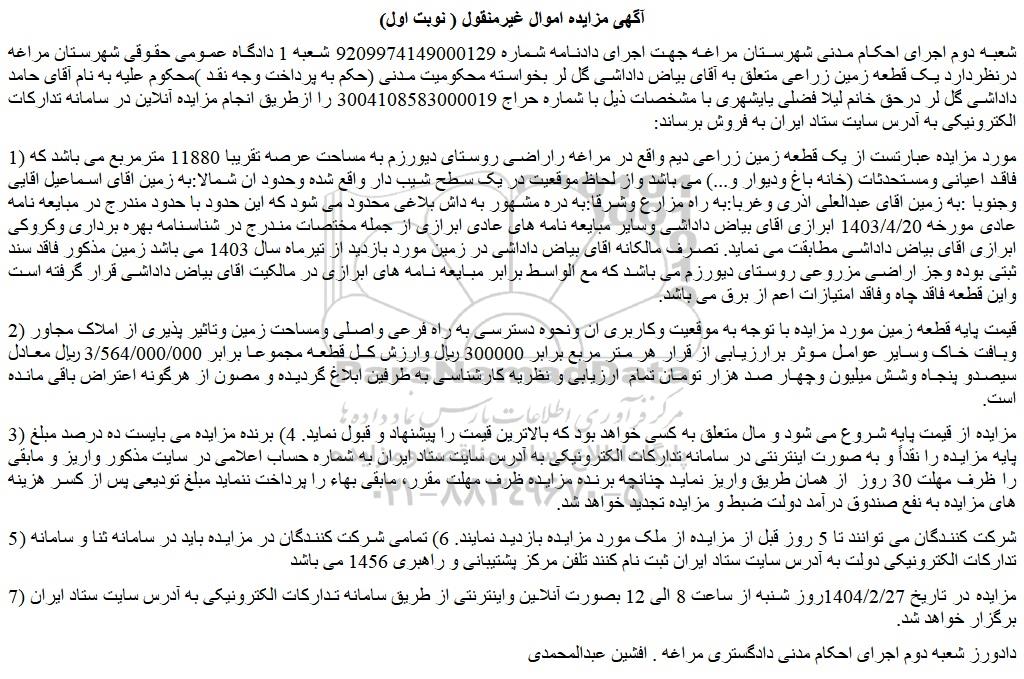 شعبه دوم اجرای احکام مدنی شهرستان مراغه جهت اجرای دادنامه شماره 9209974149000129 شعبه 1 دادگاه عمومی حقوقی شهرستان مراغه درنظردارد یک قطعه زمین زراعی متعلق به آقای بیاض داداشی گل لر بخواسته محکومیت مدنی (حکم به پرداخت وجه نقد )محکوم علیه به نام آقای حامد داداشی گل لر درحق خانم لیلا فضلی یایشهری با مشخصات ذیل با شماره حراج 3004108583000019 را ازطریق انجام مزایده آنلاین در سامانه تدارکات الکترونیکی به آدرس سایت ستاد ایران به فروش برساند: