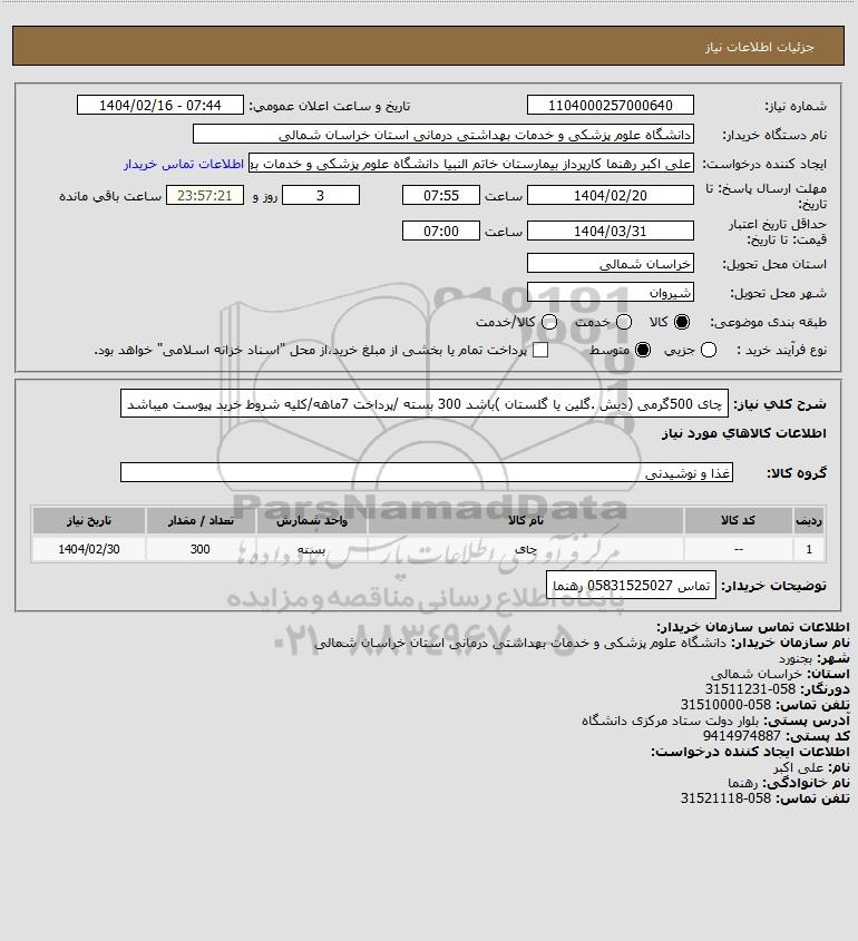 شرح کلی نیاز: چای 500گرمی (دبش .گلین یا گلستان )باشد 300 بسته /پرداخت 7ماهه/کلیه شروط خرید پیوست میباشد