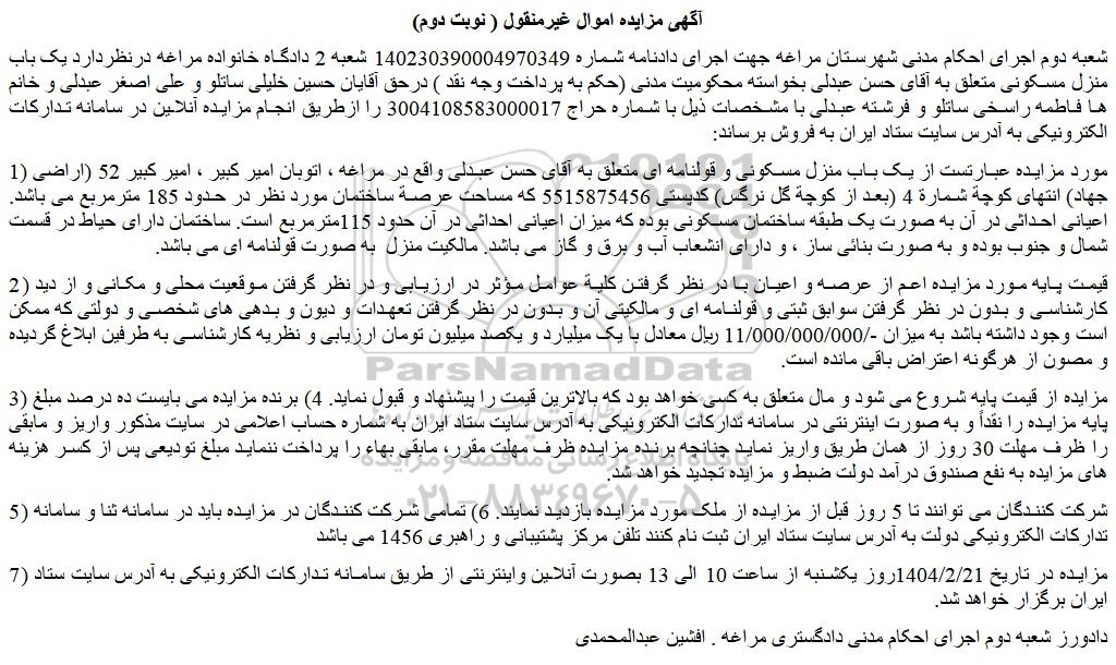 شعبه دوم اجرای احکام مدنی شهرستان مراغه جهت اجرای دادنامه شماره 140230390004970349 شعبه 2 دادگاه خانواده مراغه درنظردارد یک باب منزل مسکونی متعلق به آقای حسن عبدلی بخواسته محکومیت مدنی (حکم به پرداخت وجه نقد ) درحق آقایان حسین خلیلی ساتلو و علی اصغر عبدلی و خانم ها فاطمه راسخی ساتلو و فرشته عبدلی با مشخصات ذیل با شماره حراج 3004108583000017 را ازطریق انجام مزایده آنلاین در سامانه تدارکات الکترونیکی به آدرس سایت ستاد ایران به فروش برساند: