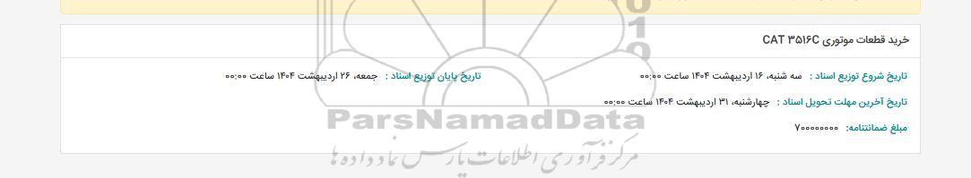 مناقصه خرید قطعات موتوری CAT 3516C از کلیه افراد متخصص و شرکتها واجد شرایط دعوت به عمل میآید در مناقصه با کد خبرگزاری پارس نماد: 8989633 شرکت نمایند.