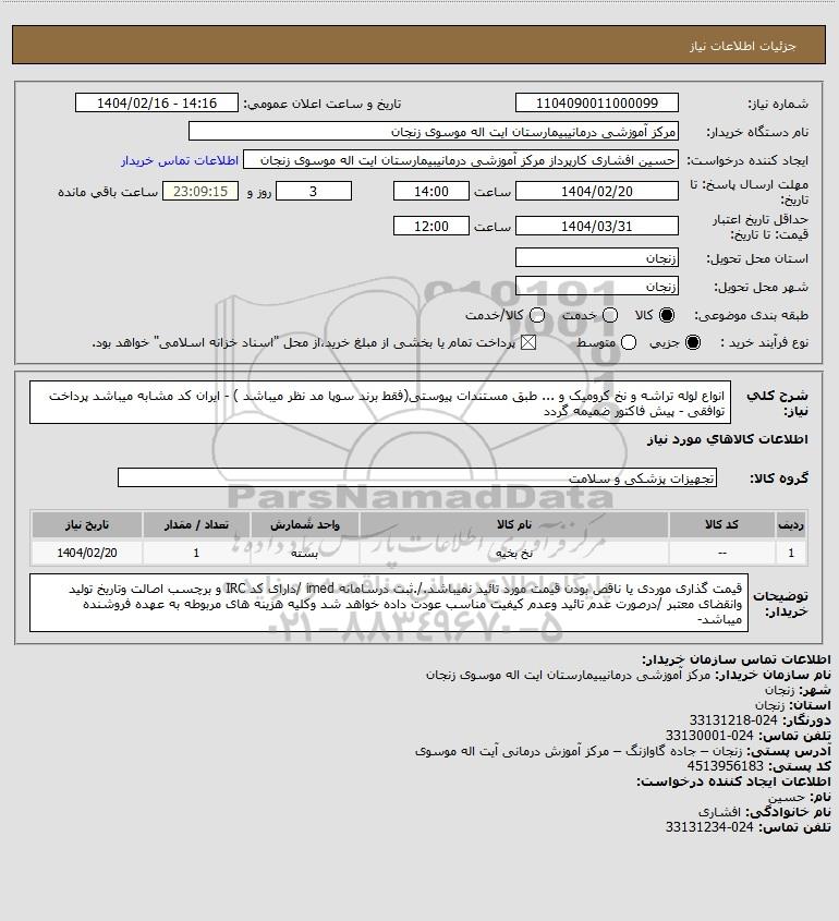 استعلام بها و موضوع استعلام استعلام انواع لوله تراشه و نخ کرومیک و ... طبق مستندات پیوستی(فقط برند سوپا مد نظر میباشد ) - ایران کد مشابه میباشد پرداخت توافقی - پیش فاکتور ضمیمه گردد به اطلاع کلیه شرکتها و افراد متخصص واجد شرایط میرساند، آگهی گذار در نظر دارد از طریق استعلام بها، نسبت به انتخاب و دریافت پیشنهادات اقدام نماید. این استعلام با کد آگهی ثبت شده در سامانه خبرگزاری پارس نماد : 8990803 منتشر شده است. مشخصات استعلام : تاریخ شروع استعلام: 1404/02/16 آخرین مهلت ارسال پیشنهاد قیمت : 1404/02/20 و محل اجرای پروژه : استان زنجان میباشد. استعلام قیمت مورد درخواست : استعلام انواع لوله تراشه و نخ کرومیک و ... طبق مستندات پیوستی(فقط برند سوپا مد نظر میباشد ) - ایران کد مشابه میباشد پرداخت توافقی - پیش فاکتور ضمیمه گردد با دستهبندیهای تخصصی و گروه های مرتبط : خدمات و تجهیزات آزمایشگاهی و پزشکی, استعلام اطلاع رسانی میگردد.