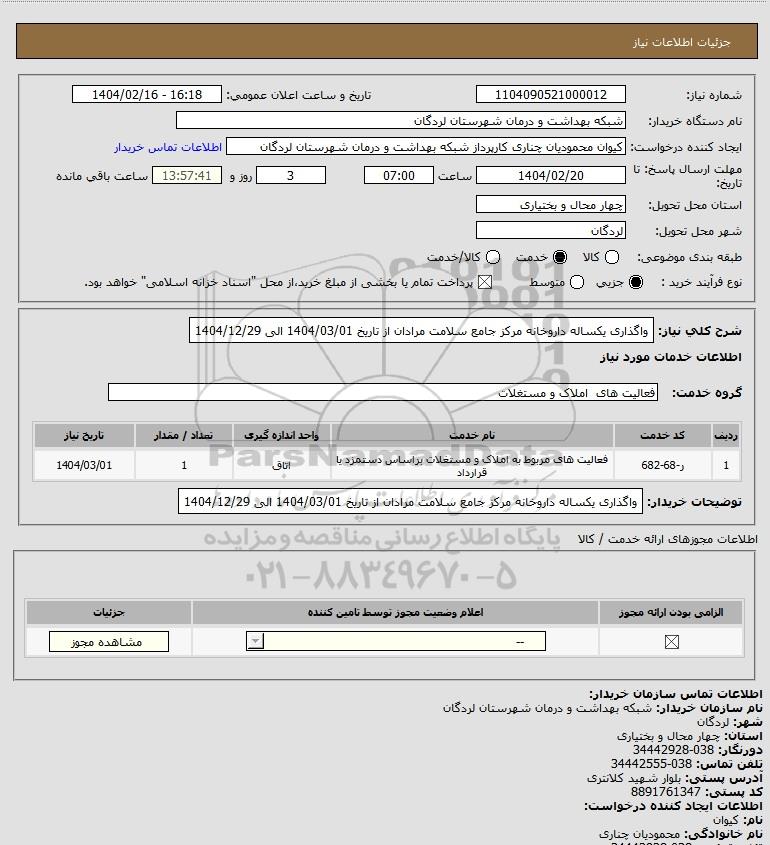 توضیحات خریدار:واگذاری یکساله داروخانه مرکز جامع سلامت مرادان از تاریخ 1404/03/01 الی 1404/12/29