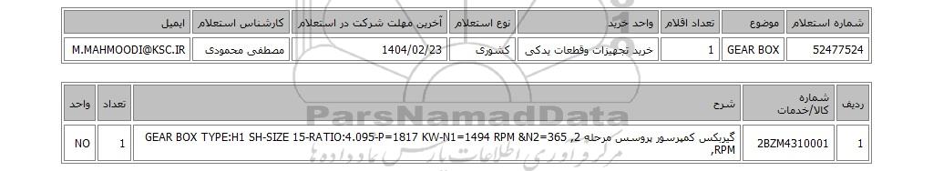 | 52477524 | GEAR BOX | 1 | خرید تجهیزات وقطعات یدکی | کشوری | 1404/02/23 | مصطفی محمودی | M.MAHMOODI@KSC.IR |