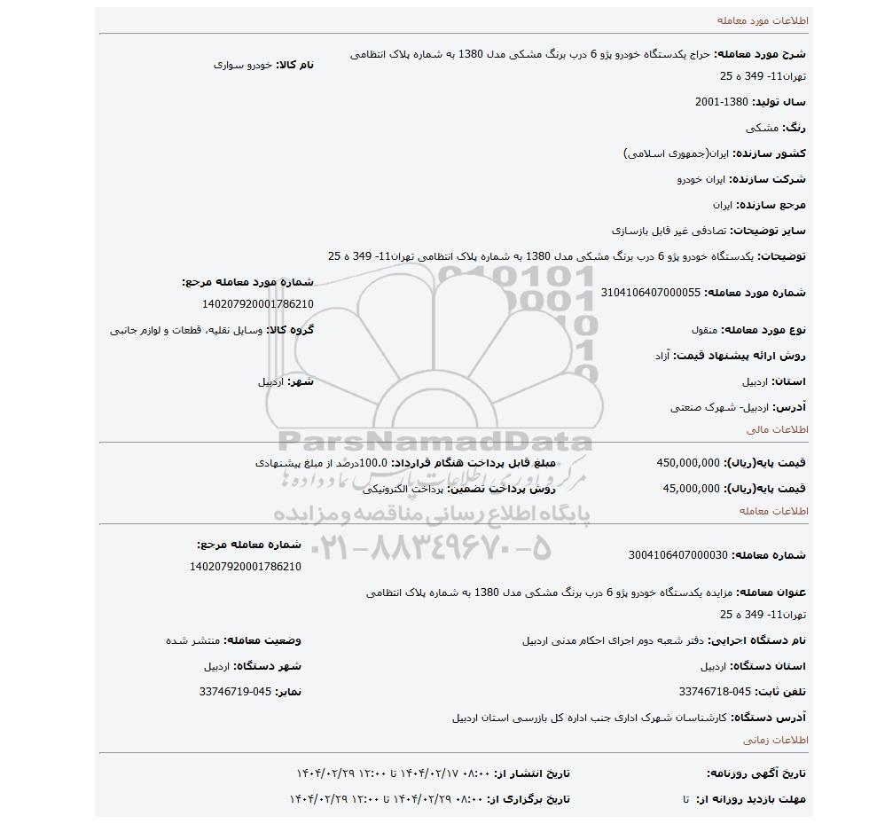قیمت پایه(ریال): 45,000,000 | روش پرداخت تضمین: پرداخت الکترونیکی |