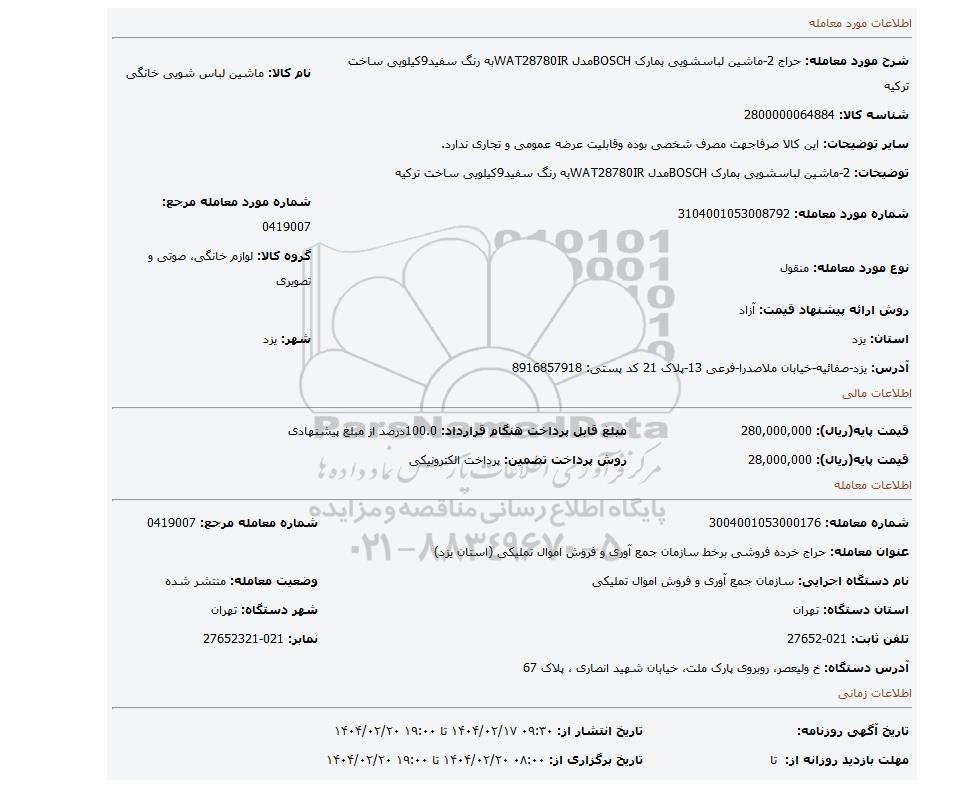 مزایده عمومی مزایده 2-ماشین لباسشویی بمارک BOSCHمدل WAT28780IRبه رنگ سفید9کیلویی ساخت ترکیه برگزار میگردد. از کلیه افراد متخصص و شرکت‌های واجد شرایط دعوت به عمل می‌آید تا در این مزایده با کد خبرگزاری پارس نماد : 8994941 شرکت نمایند تاریخ شروع مزایده : 1404/02/17 مهلت شرکت در مزایده: تا پایان روز 1404/02/20 مکان برگزاری اموال واگذاری استان‌های یزد و دسته‌بندی‌های مربوط به این حراجی متفرقه میباشد.