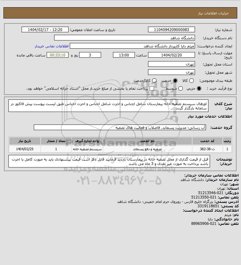 شرح کلی نیاز: اورهال سیستم تصفیه خانه بیمارستان شامل اچناس و اجرت