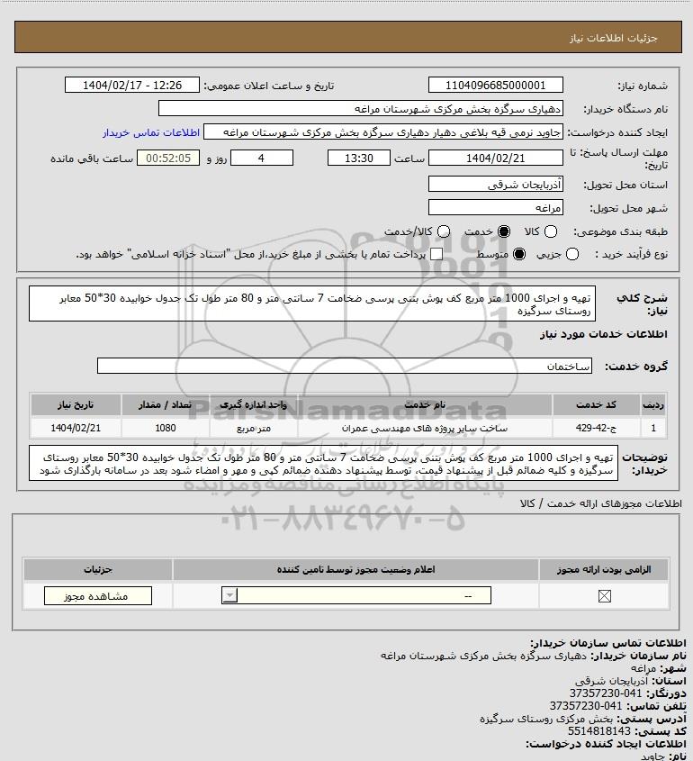 شرح کلی نیاز: تهیه و اجرای 1000 متر مربع کف پوش بتنی پرسی ضخامت 7 سانتی متر و 80 متر طول تک جدول خوابیده 30*50 معابر روستای سرگیزه