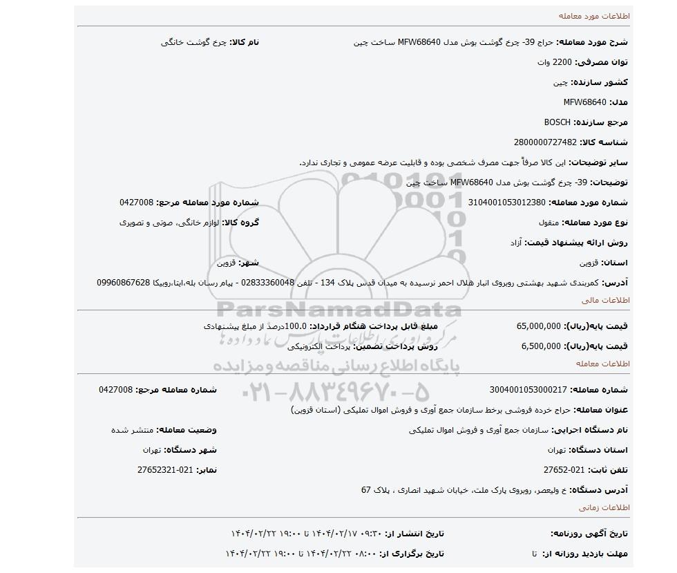 مزایده عمومی مزایده 39- چرخ گوشت بوش مدل MFW68640 ساخت چین برگزار میگردد. از کلیه افراد متخصص و شرکتهای واجد شرایط دعوت به عمل میآید تا در این مزایده با کد خبرگزاری پارس نماد : 8997081 شرکت نمایند تاریخ شروع مزایده : 1404/02/17 مهلت شرکت در مزایده: تا پایان روز 1404/02/22 مکان برگزاری اموال واگذاری استانهای قزوین و دستهبندیهای مربوط به این حراجی متفرقه میباشد.