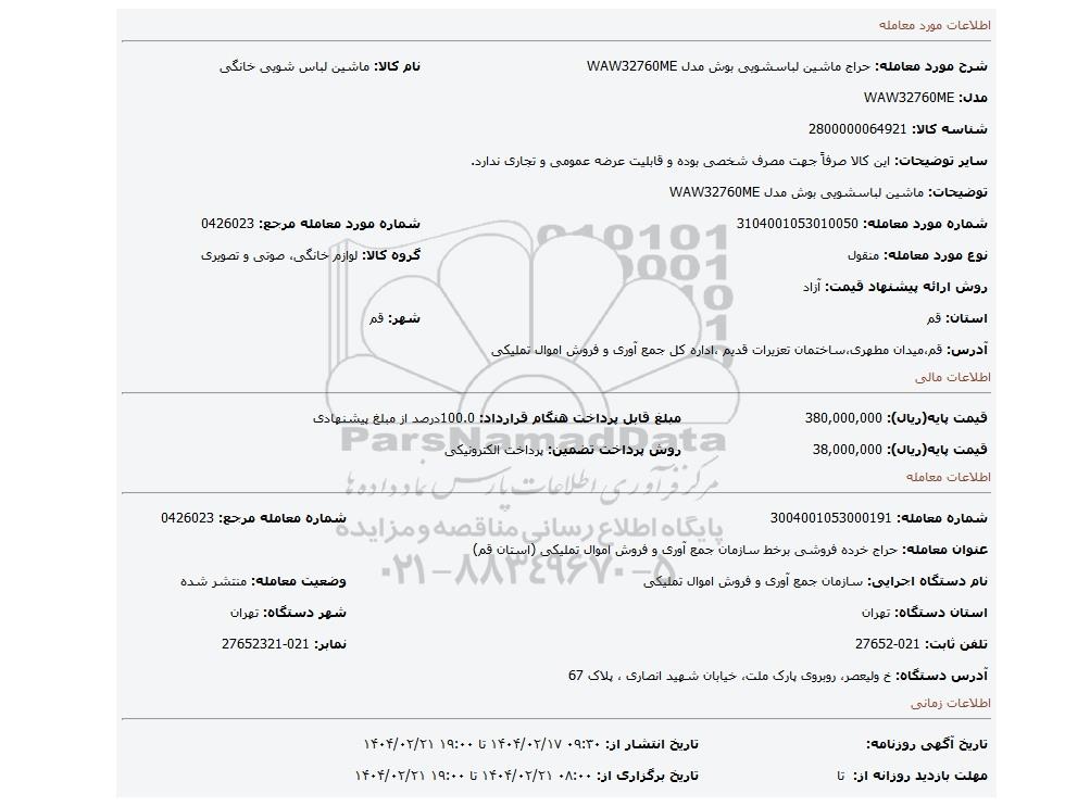 مزایده عمومی مزایده ماشین لباسشویی بوش مدل WAW32760ME برگزار میگردد. از کلیه افراد متخصص و شرکت‌های واجد شرایط دعوت به عمل می‌آید تا در این مزایده با کد خبرگزاری پارس نماد : 8997545 شرکت نمایند تاریخ شروع مزایده : 1404/02/17 مهلت شرکت در مزایده: تا پایان روز 1404/02/21 مکان برگزاری اموال واگذاری استان‌های قم و دسته‌بندی‌های مربوط به این حراجی متفرقه میباشد.