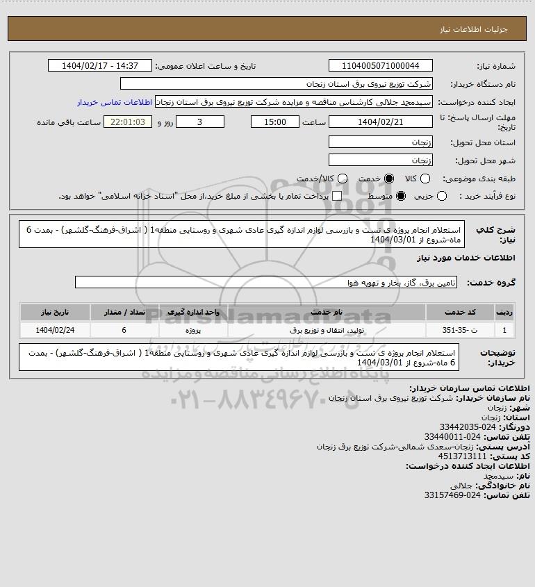 شرح کلی نیاز: استعلام انجام پروژه ی تست و بازرسی لوازم اندازه گیری عادی شهری و روستایی منطقه1 ( اشراق-فرهنگ-گلشهر) - بمدت 6 ماه-شروع از 1404/03/01
