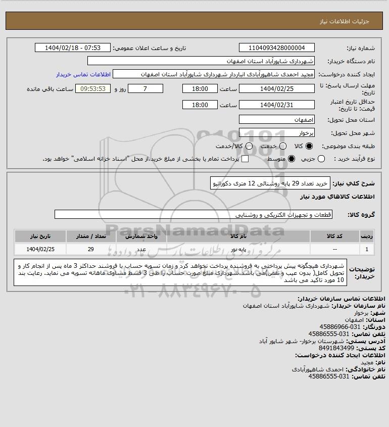 شرح کلی نیاز: خرید تعداد 29 پایه روشنائی 12 متری دکوراتیو