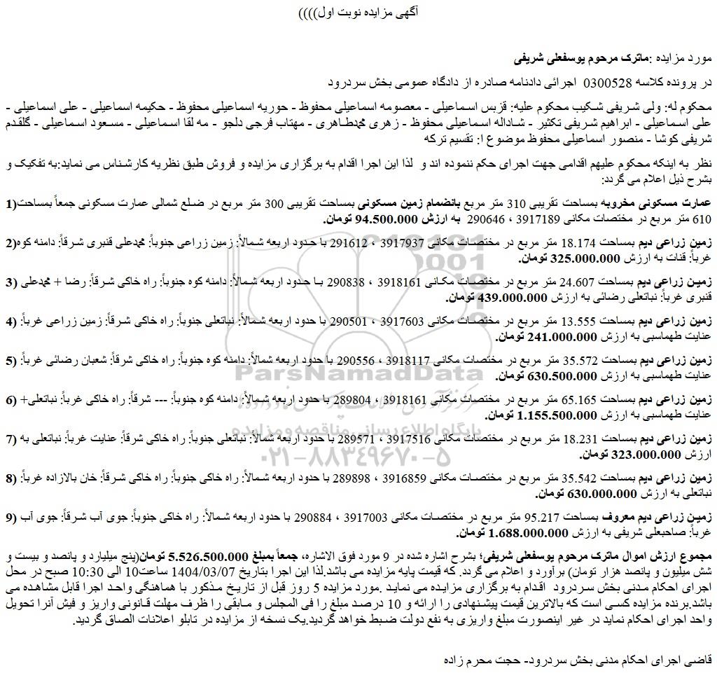مورد مزایده :ماترک مرحوم یوسفعلی شریفی