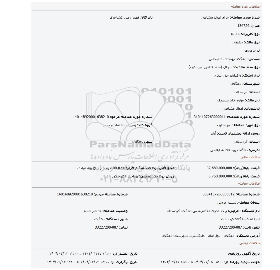 | شرح مورد معامله: حراج اموال مشاعی | نام کالا: قطعه زمین کشاورزی | |
