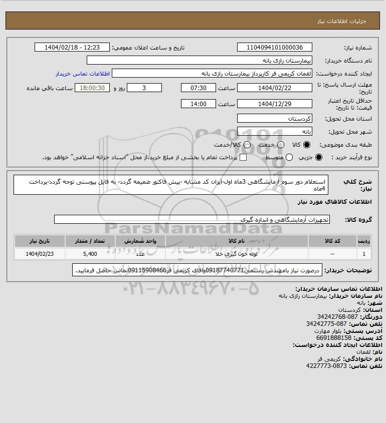 شرح کلی نیاز: استعلام دور سوم ازمایشگاهی 3ماه اول-ایران کد مشابه -پیش فاکتور ضمیمه گردد- به فایل پیوستی توجه گردد-پرداخت 4ماه
