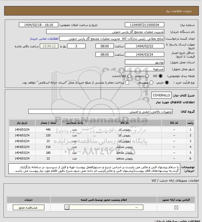 استعلام بها و موضوع استعلام استعلام COVERALLS به اطلاع کلیه شرکتها و افراد متخصص واجد شرایط میرساند، آگهی گذار در نظر دارد از طریق استعلام بها، نسبت به انتخاب و دریافت پیشنهادات اقدام نماید. این استعلام با کد آگهی ثبت شده در سامانه خبرگزاری پارس نماد : 9002484 منتشر شده است. مشخصات استعلام : تاریخ شروع استعلام: 1404/02/18 آخرین مهلت ارسال پیشنهاد قیمت : 1404/02/22 و محل اجرای پروژه : استان بوشهر میباشد. استعلام قیمت مورد درخواست : استعلام COVERALLS با دستهبندیهای تخصصی و گروه های مرتبط : البسه و پوشاک, سیستم ایمنی ، اتش نشانی،اعلام و اطفای حریق, استعلام اطلاع رسانی میگردد.