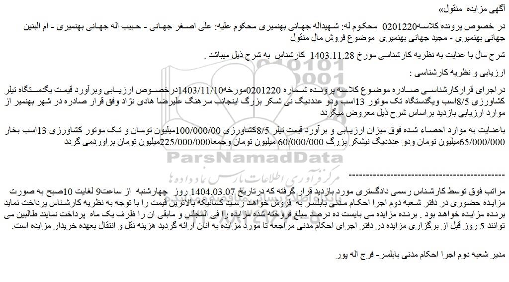 در خصوص پرونده کلاسه0201220 محکوم له: شهیداله جهانی بهنمیری محکوم علیه: علی اصغر جهانی - حبیب اله جهانی بهنمیری - ام البنین جهانی بهنمیری - مجید جهانی بهنمیری موضوع فروش مال منقول