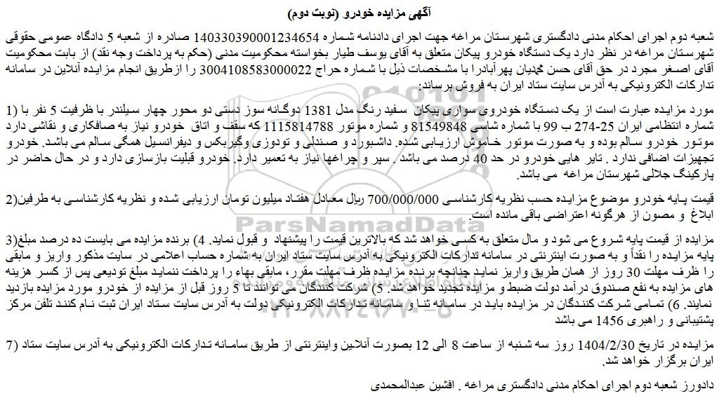 شعبه دوم اجرای احکام مدنی دادگستری شهرستان مراغه جهت اجرای دادنامه شماره 140330390001234654 صادره از شعبه 5 دادگاه عمومی حقوقی شهرستان مراغه در نظر دارد یک دستگاه خودرو پیکان متعلق به آقای یوسف طیار بخواسته محکومیت مدنی (حکم به پرداخت وجه نقد) از بابت محکومیت آقای اصغر مجرد در حق آقای حسن محمدیان پهرآبادرا با مشخصات ذیل با شماره حراج 3004108583000022 را ازطریق انجام مزایده آنلاین در سامانه تدارکات الکترونیکی به آدرس سایت ستاد ایران به فروش برساند: