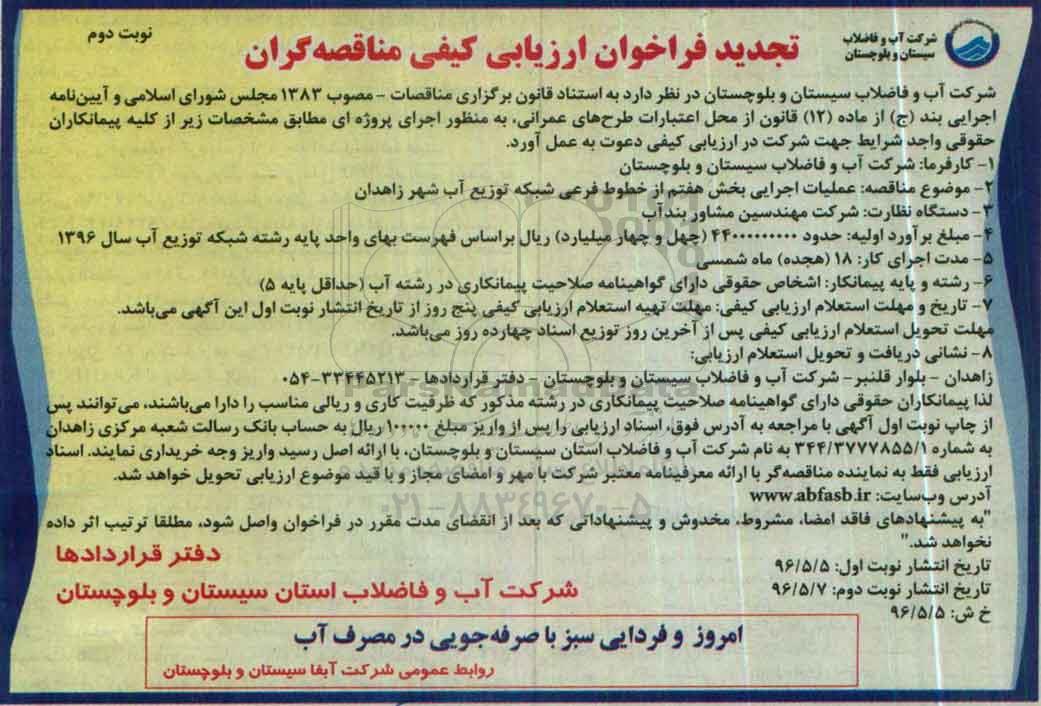 شرکت آب و فاضلاب سیستان و بلوچستان در نظر دارد به استناد قانون برگزاری مناقصات - مصوب 1383 مجلس شورای اسلامی و آیین نامه اجرایی بند (ج) از ماده (12) قانون از محل اعتبارات عمرانی به منظور اجرای پروژه ای مطابق مشخصات زیر از کلیه پیمانکاران حقوقی واجد شرایط جهت شرکت در ارزیابی کیفی دعوت به عمل آورد.