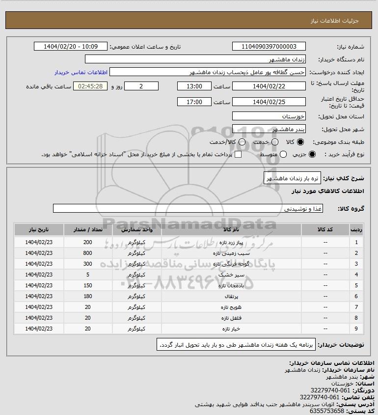 شرح کلی نیاز: تره بار زندان ماهشهر