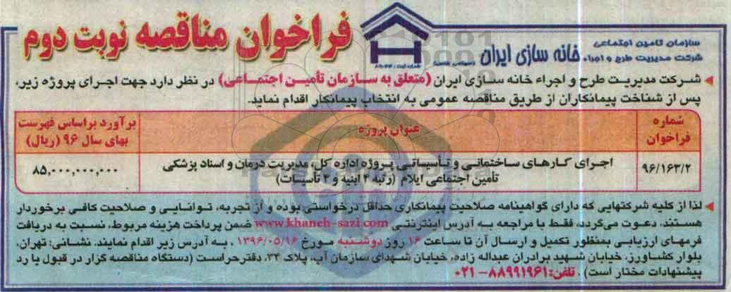 | 96/163/1 | اجرای کارهای ساختمانی و تاسیساتی پروژه اداره کل ، مدیریت درمان و اسناد پزشکی تامین اجتماعی ایلام (رتبه 4 ابنیه و 4 تاسیسات) |