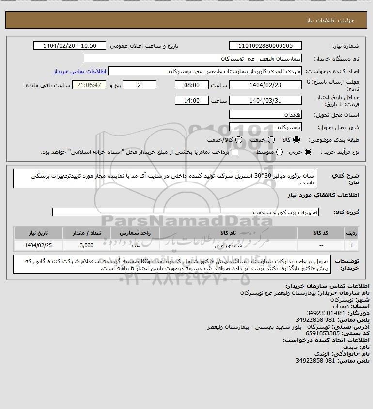 شرح کلی نیاز: شان پرفوره دیالیز 30*30 استریل