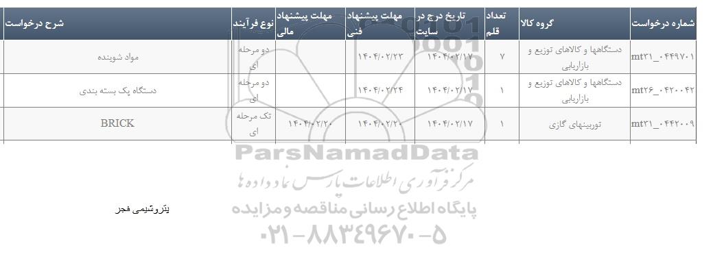mt31- 0449701 دستگاهها و کالاهای توزیع و بازاریابی 7 1404.02.17 1404.2.23 دومرحله ای  مواد شوینده