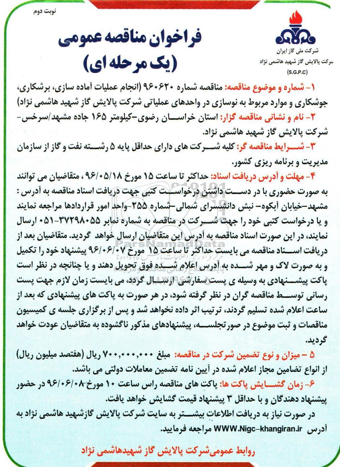 1- شماره و موضوع مناقصه : مناقصه شماره 960620 انجام عملیات آماده سازی ، برشکاری ، جوشکاری و موارد مربوط به نوسازی در واحدهای عملیاتی شرکت پالایش گاز شهید هاشمی نژاد
