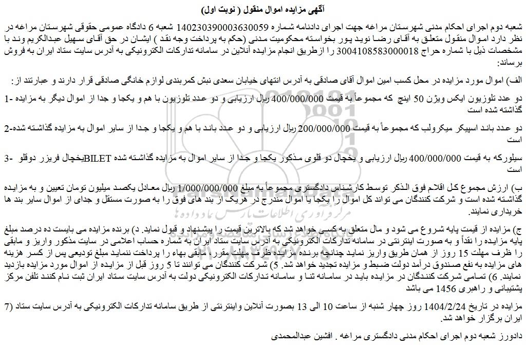 شعبه دوم اجرای احکام مدنی شهرستان مراغه جهت اجرای دادنامه شماره 140230390003630059 شعبه 6 دادگاه عمومی حقوقی شهرستان مراغه در نظر دارد اموال منقول متعلق به آقای رضا نوید پور بخواسته محکومیت مدنی (حکم به پرداخت وجه نقد ) ایشان در حق آقای سهیل عبدالکریم وند با مشخصات ذیل با شماره حراج 3004108583000018 را ازطریق انجام مزایده آنلاین در سامانه تدارکات الکترونیکی به آدرس سایت ستاد ایران به فروش برساند: