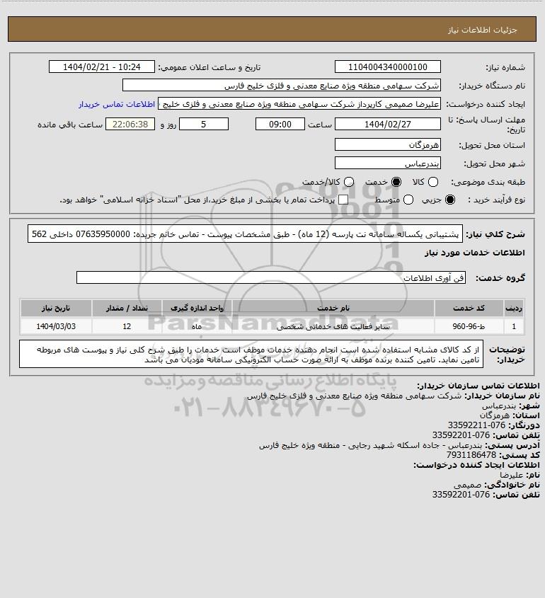 شرح کلی نیاز: پشتیبانی یکساله سامانه نت پارسه (12 ماه) - طبق مشخصات پیوست - تماس خانم جریده: 07635950000 داخلی 562
