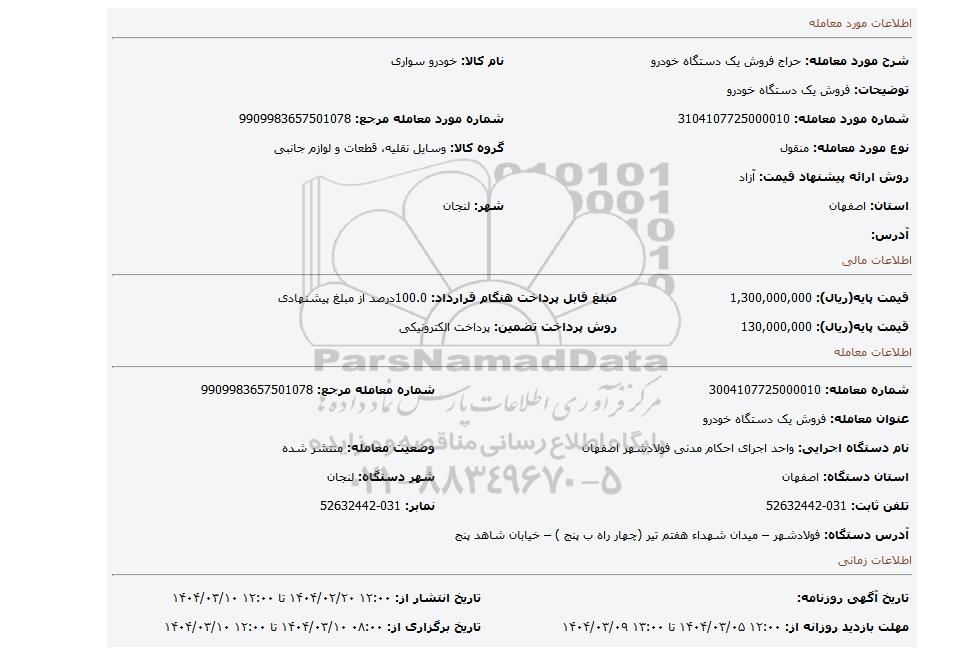 | شماره مورد معامله: 3104107725000010 | شماره مورد معامله مرجع: 9909983657501078 | |