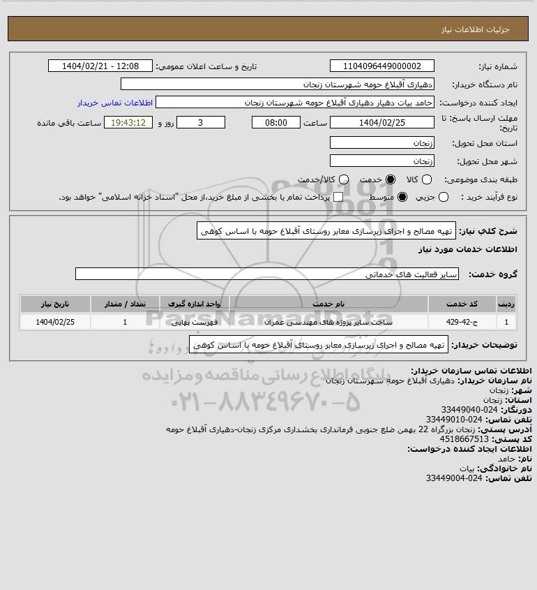 شرح کلی نیاز: تهیه مصالح و اجرای زیرسازی معابر روستای آقبلاغ حومه با اساس کوهی