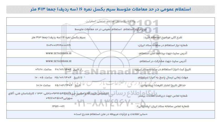 استعلام عمومی در حد معاملات متوسط سیم بکسل نمره 16 (سه ردیف) جمعا 413 متر