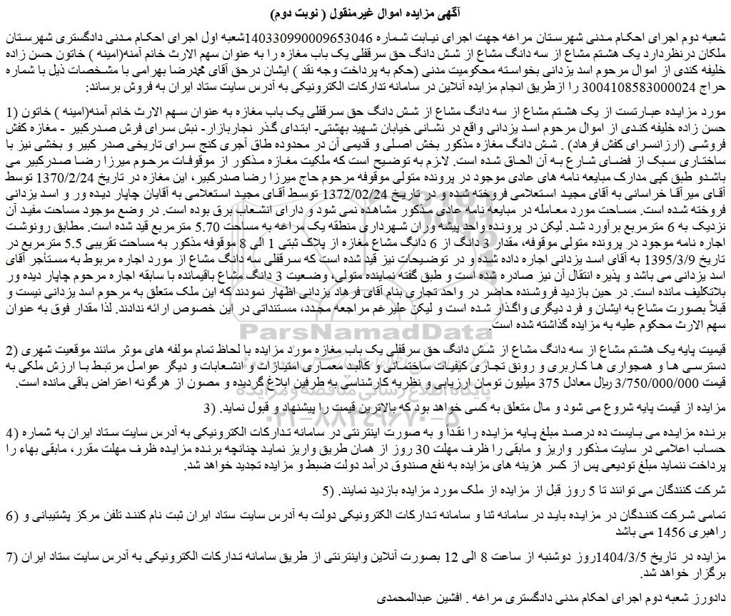 شعبه دوم اجرای احکام مدنی شهرستان مراغه جهت اجرای نیابت شماره 140330990009653046شعبه اول اجرای احکام مدنی دادگستری شهرستان ملکان درنظردارد یک هشتم مشاع از سه دانگ مشاع از شش دانگ حق سرقفلی یک باب مغازه را به عنوان سهم الارث خانم آمنه(امینه ) خاتون حسن زاده خلیفه کندی از اموال مرحوم اسد یزدانی بخواسته محکومیت مدنی (حکم به پرداخت وجه نقد ) ایشان درحق آقای محمدرضا بهرامی با مشخصات ذیل با شماره حراج 3004108583000024 را ازطریق انجام مزایده آنلاین در سامانه تدارکات الکترونیکی به آدرس سایت ستاد ایران به فروش برساند: