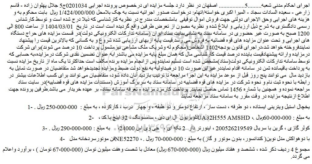اجرای احکام مدنی شعبه.........5................. اصفهان در نظر دارد جلسه مزایده ای درخصوص پرونده اجرایی 0201034ج5 جلال پهلوان زاده - قاسم زارعی - سعیده السادات سجاد - المیرا اکبری خواسته/اتهام: درخواست صدور اجرائیه نسبت به چک بلامحل 1/424/000/000 ریال بابت محکوم به و هزینه های اجرایی وحق الاجرای دولتی جهت فروش اموال توقیفی بامشخصات مندرج در نظریه کارشناسی که ذیلا درج شده است و توسط کارشناس رسمی دادگستری به شرح ذیل ارزیابی و ابلاغ شده و نظریه مصون از تعرض طرفین واقع گردیده است است در تاریخ 1404/03/01 از ساعت 800 الی 1200 صبح به صورت غیر حضوری در سامانه ستاد به نشانیسایت ستاد ایران (سامانه تدارکات الکترونیکی دولت)در قسمت مزایده های حراج دستگاه های اجرایی و تحت عنوان مزایده های قوه قضائیه به فروش می رسد.قیمت پایه ازبهای ارزیابی شده شروع و به کسانی که بالاترین قیمت را پیشنهاد نمایندفروخته خواهد شد،دراجرای قانون بودجه1402 اشخاص(محکوم له وشریک ملک مشاعی نیزمشمول پرداخت 10 درصد می شوند)برای شرکت درمزایده وارائه پیشنهادقیمت بایدده درصد قیمت کارشناسی مال که همان مبلغ پایه مزایده می باشدرابه عنوان تضمین نقدی شرکت درمزایده،به حسابی که توسط سامانه تدارکات الکترونیکی دولت(ستاد)مشخص شده است تسلیم نمایندوپس ازانجام مزایده برنده مکلف است حداکثرتا یک ماه از تاریخ مزایده نسبت به پرداخت باقیمانده ثمن در سامانه اقدام نمایددرغیراین صورت 10 درصداولیه به نفع دولت ضبط ومزایده تجدیدخواهد شد متقاضیان در صورت تمایل به بازدید مال می توانند پنج روز قبل از موعد مزایده به این اجرا مراجعه تا ترتیب بازدید آنان داده شود، متقاضیان می توانند برای کسب اطلاعات بیشتر در رابطه با نحوه ثبت نام و نحوه شرکت در مزایده های قوه قضاییه در سامانه ستاد به سربرگ آموزش (مستندات مزایده های قوه قضاییه)در سایت ستاد مراجعه نموده و همچنین با شماره 1456 تماس حاصل نمایند. پرداخت کارمزد مزایده - تعرفه سامانه ستاد- بر عهده خریدار می باشد.طرفین پرونده جهت اطلاع ازنتیجه مزایده در وقت مقرر به سامانه ستاد مراجعه نمایند