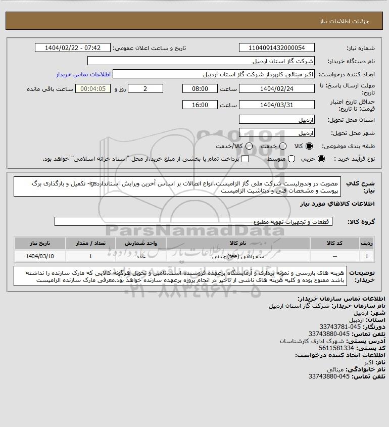 استعلام بها و موضوع استعلام استعلام عضویت در وندورلیست شرکت ملی گاز الزامیست.انواع اتصالات بر اساس آخرین ویرایش استانداردigs- تکمیل و بارگذاری برگ پیوست و مشخصات فنی و دیتاشیت الزامیست به اطلاع کلیه شرکتها و افراد متخصص واجد شرایط میرساند، آگهی گذار در نظر دارد از طریق استعلام بها، نسبت به انتخاب و دریافت پیشنهادات اقدام نماید. این استعلام با کد آگهی ثبت شده در سامانه خبرگزاری پارس نماد : 9014859 منتشر شده است. مشخصات استعلام : تاریخ شروع استعلام: 1404/02/22 آخرین مهلت ارسال پیشنهاد قیمت : 1404/02/24 و محل اجرای پروژه : استان اردبیل میباشد. استعلام قیمت مورد درخواست : استعلام عضویت در وندورلیست شرکت ملی گاز الزامیست.انواع اتصالات بر اساس آخرین ویرایش استانداردigs- تکمیل و بارگذاری برگ پیوست و مشخصات فنی و دیتاشیت الزامیست با دستهبندیهای تخصصی و گروه های مرتبط : لوله و اتصالات, لوله های فولادی و چدنی, تجهیزات نفت و گاز, استعلام اطلاع رسانی میگردد. شرایط شرکت در استعلام آنلاین : ابتدا ثبت نام در سامانه استعلام پارس نماد و تکمیل مدارک موردنیاز و بارگذاری در سامانه رعایت تمامی ضوابط و الزامات مندرج در اسناد استعلام است.