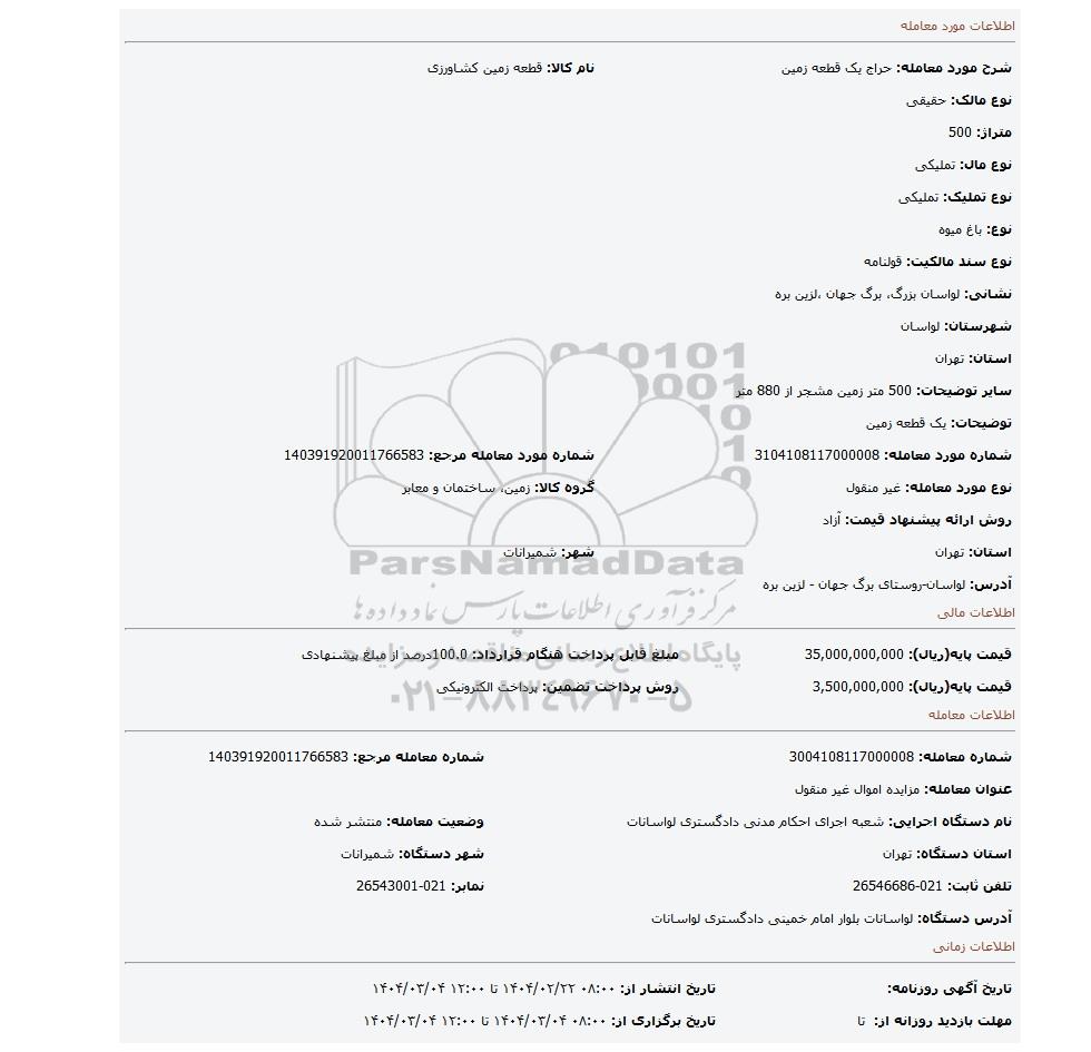 | شرح مورد معامله: حراج یک قطعه زمین | نام کالا: قطعه زمین کشاورزی | |