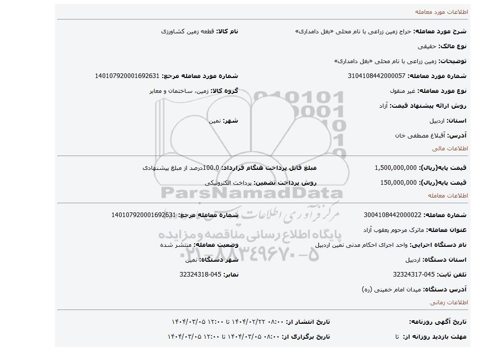 مزایده عمومی مزایده زمین زراعی با نام محلی «بغل دامداری» برگزار میگردد. از کلیه افراد متخصص و شرکتهای واجد شرایط دعوت به عمل میآید تا در این مزایده با کد خبرگزاری پارس نماد : 9018050 شرکت نمایند تاریخ شروع مزایده : 1404/02/22 مهلت شرکت در مزایده: تا پایان روز 1404/03/05 مکان برگزاری اموال واگذاری استانهای اردبیل و دستهبندیهای مربوط به این حراجی ماشین آلات و تجهیزات کشاورزی و دام پروری, سرمایه گذاری میباشد.