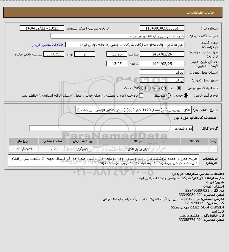 شرح کلی نیاز: الکل ایزوپروپیل LG ( مقدار 1120 کیلو گرم ) ( پیش فاکتور الزامی می باشد )