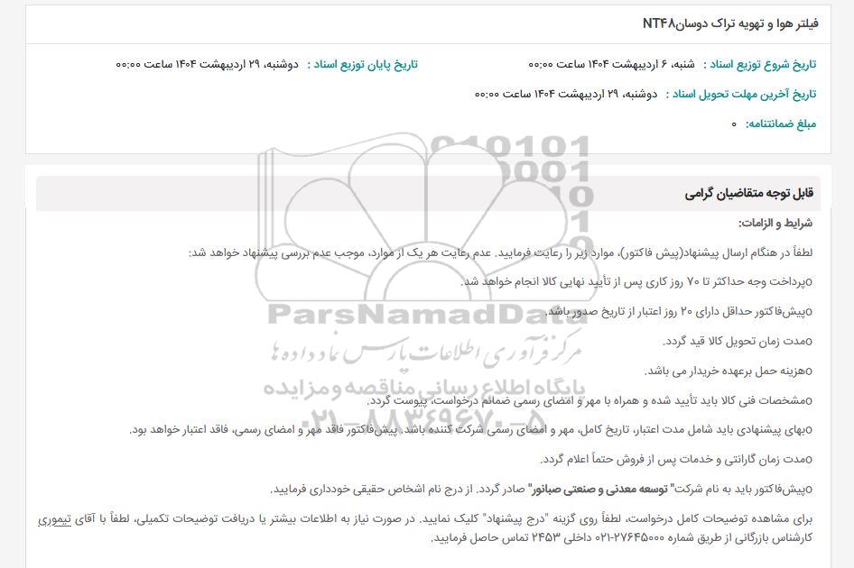 استعلام بها و موضوع استعلام استعلام فیلتر هوا و تهویه تراک دوسان NT48 به اطلاع کلیه شرکتها و افراد متخصص واجد شرایط میرساند، آگهی گذار در نظر دارد از طریق استعلام بها، نسبت به انتخاب و دریافت پیشنهادات اقدام نماید. این استعلام با کد آگهی ثبت شده در سامانه خبرگزاری پارس نماد : 9019240 منتشر شده است. مشخصات استعلام : تاریخ شروع استعلام: 1404/02/22 آخرین مهلت ارسال پیشنهاد قیمت : 1404/02/29 و محل اجرای پروژه : استان تهران میباشد. استعلام قیمت مورد درخواست : استعلام فیلتر هوا و تهویه تراک دوسان NT48 با دستهبندیهای تخصصی و گروه های مرتبط : انواع فیلتر های تصفیه, تاسیسات ساختمانی, صنایع حرارتی و برودتی, سیستم تهویه و هواکشی صنعتی, تجهیزات و ماشین آلات صنعتی, تجهیزات و ماشین آلات حفاری, استعلام اطلاع رسانی میگردد.
