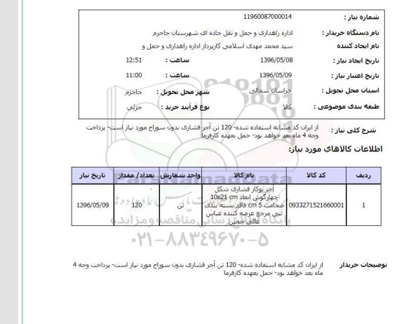 شرح کلی نیاز از ایران کد مشابه استفاده شده ـ 120 تن آجر فشاری بدون سوراخ مورد نیاز است. پرداخت وجه 4 ماه بعد خواهد بود. ـ حمل بعهده کارفرما