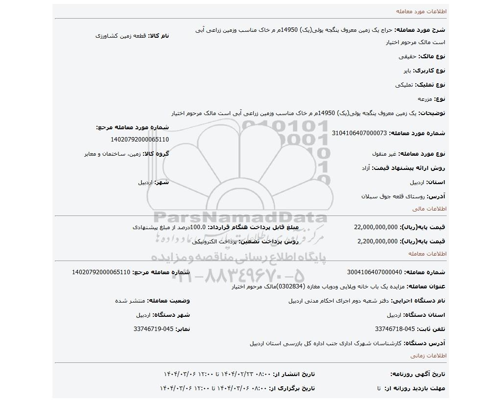 شماره مورد معامله: 3104106407000073 | شماره مورد معامله مرجع: 14020792000065110 | |