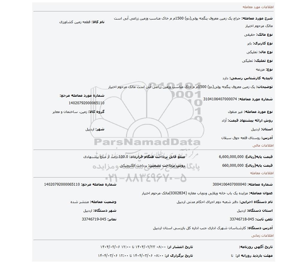 قیمت پایه(ریال): 660,000,000روش پرداخت تضمین: پرداخت الکترونیکی