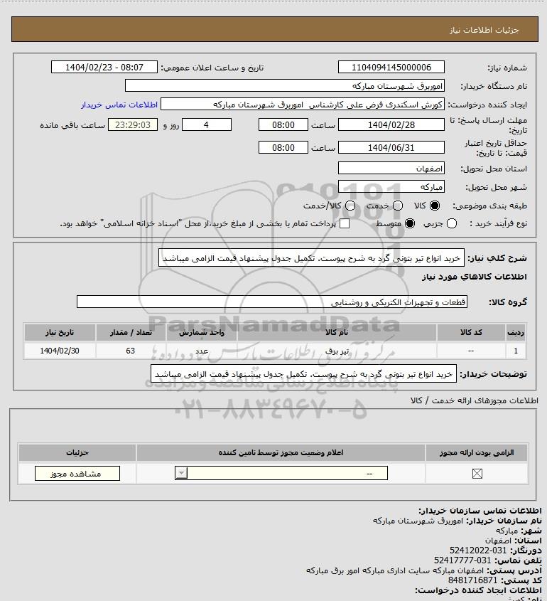 استعلام خرید انواع تیر بتونی گرد به شرح پیوست. تکمیل جدول پیشنهاد قیمت الزامی میباشد, استعلام خرید انواع تیر بتونی گرد به شرح پیوست. تکمیل جدول پیشنهاد قیمت الزامی میباشد