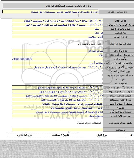 علاقهمندان میتوانند جهت دریافت اسناد و اطلاعات تکمیلی، مناقصه خرید۱۰۰۰میزوصندلی دانش آموزی متوسطه اول با سامانه مناقصات و مزایدات ایران پارسنماد داده ها 88349670 تماس حاصل نمایند.