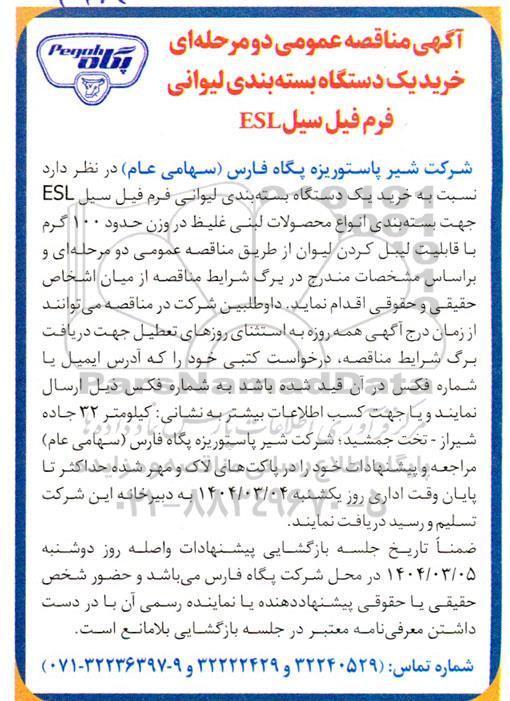 شرکت شیر پاستوریزه پگاه فارس (سهامی عام) در نظر دارد نسبت به خرید یک دستگاه بسته بندی لیوانی فرم فیل سیل ESL جهت بسته بندی انواع محصولات لبنی غلیظ در وزن حدود 100 گرم با قابلیت لیبل کردن لیوان از طریق مناقصه عمومی دو مرحله ای و بر اساس مشخصات مندرج در برگ شرایط مناقصه از میان اشخاص حقیقی و حقوقی اقدام نماید. داوطلبین شرکت در مناقصه می توانند از زمان درج آگهی همه روزه به استثنای روزهای تعطیل جهت دریافت برگ شرایط مناقصه درخواست کتبی خود را که آدرس ایمیل یا شماره فکس در آن قید شده باشد به شماره فکس ذیل ارسال نمایند و یا جهت کسب اطلاعات بیشتر به نشانی کیلومتر 32 جاده شیراز - تخت جمشید - شرکت شیر پاستوریزه پگاه فارس (سهامی عام) مراجعه و پیشنهادات خود را در پاکت های لاک و مهر شده حداکثر تا پایان وقت اداری روز یکشنبه 1404.3.04 به دبیرخانه این شرکت تسلیم و رسید دریافت نمایند.